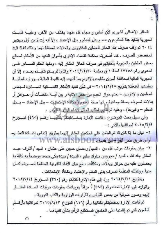 وفقا لاحكام القانون رقم 114 لسنة 008 وبنسبة 20% من الاساسى اعتبارا من 1 / 7 / 2011 وفقا لاحكام المرسوم بقانون رقم 51 لسنة 2011 وتح الحصول بالفعل على حكم قضائى لاصحاب الدعوى حيث اوردت المحكمة فى اسباب حكمها ان منح الداعين بدل الاعتماد وبدل المعلم لايمنع حصولهم على الحافز الشهرى الاضافى وقاتمت المديرية بتنفيذ الحكم .