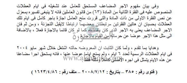 ينشر موقع السبورة فتوي قسمي الفتوي والتشريع بمجلس الدولة رقم 385 بالملف رقم 86 - 4 - 1623 والمؤرخة في 12-7-2008م بشأن مفهوم الاجر المضاعف المستحق للعامل عند تشعيله في أيام العطلات.