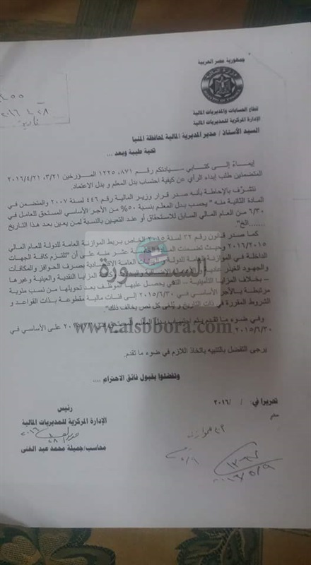 بالمستندات| ننشر فاكس صرف بدل الاعتماد للمعلمين على أساسى 2016/6/30