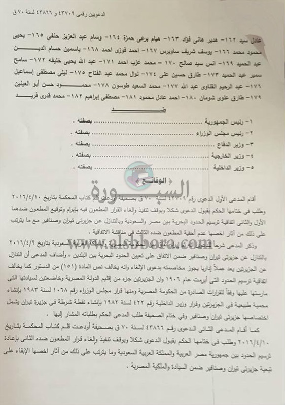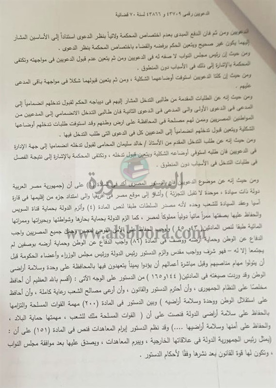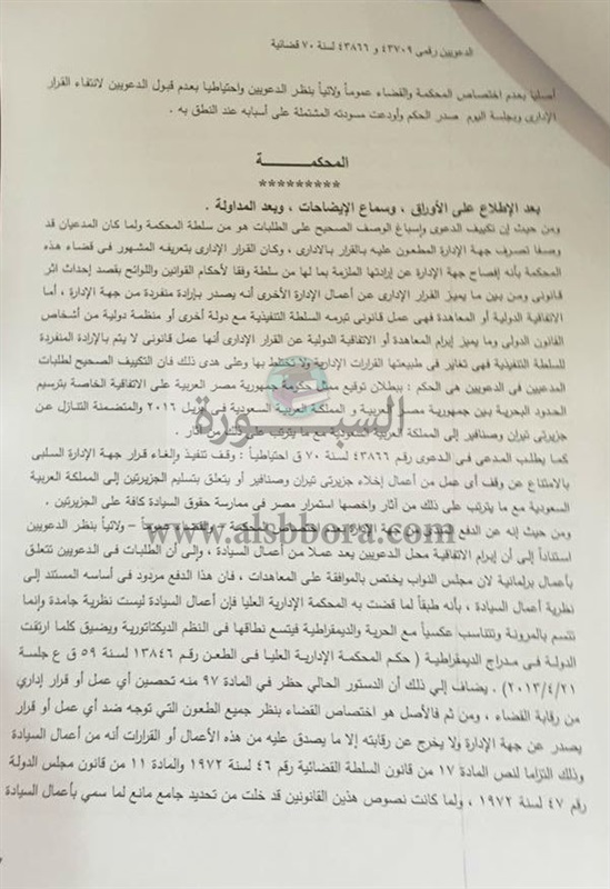 وكانت الدائرة الأولى بمحكمة القضاء الإداري بمجلس الدولة، قد قضت ببطلان توقيع اتفاقية اعادة ترسيم الحدود وتسليم الجزيرتين للسعودية، كما قضت باستمرار تبعية الجزيرتين للسيادة المصرية.