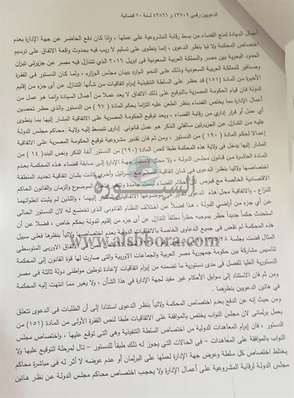 وتنشر "السبورة" الحيثيات الكاملة لحكم محكمة القضاء الإداري ببطلان توقيع ممثل الحكومة المصرية على اتفاقية ترسيم الحدود البحرية بين مصر والسعودية الموقعة في أبريل 2016.
