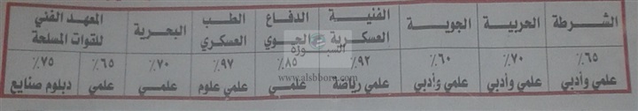 ينشر موقع السبورة التعليمى جدول تنسيق القبول بالكليات العسكرية، حيث اعلنت كلية الشرطة عن قبول طلاب الثانوية العامة للعام الدراسى المقبل 2017/2016 بمجموع 65% للقسمين العلمى والأدبى، بينما اعلنت الكلية الحربية عن قبول الطلاب بمجموع 70% للقسمين العلمى والأدبى، وجاءت أقل الكليات فى مجموع القبول الكلية الجوية بنسبة 60% لقسمى الثانوية العامة" أدبى وعلمى"، وأعلنت الفنية العسكرية عن قبول طلاب الثانوية قسم علمى رياضيات بمجموع 92%، والدفاع الجوى بنسبة 85%، والطب العسكرى بنسبة 97%، وأخيرا الكلية البحرية بنسبة 70% للعلمى.