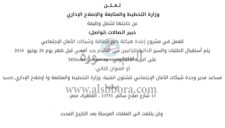 وزارة التخطيط والمتابعة والاصلاح الادارى تعلن عن وظائف للشباب والتقديم حتى 28 / 6 / 2016.. ننشر الاعلان