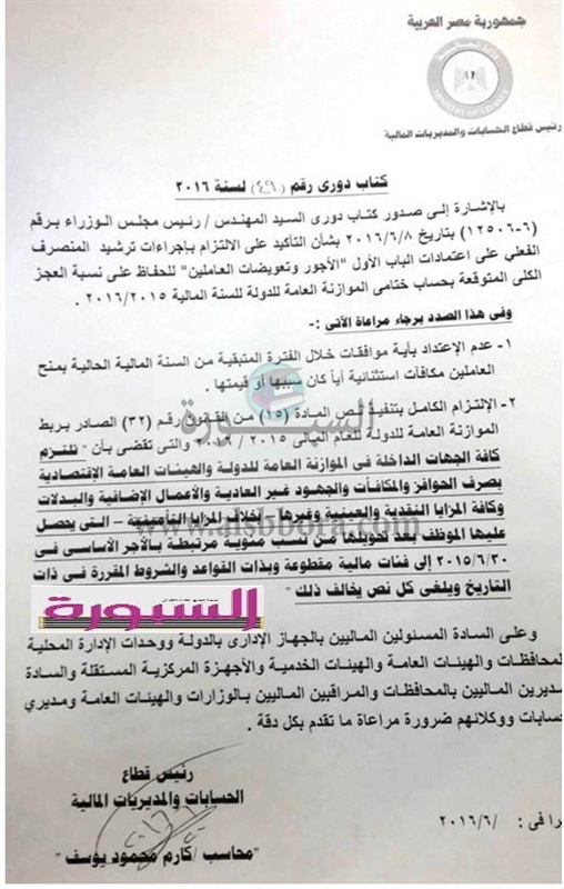 أصدر مجلس الوزراء ووزارة المالية كتابا دوريا يطالب فيه جميع الادارات المالية فى الدولة بضرورة الالتزام الكامل بتنفيذ نص المادة 15 من القانون رقم 32 والذى يتضمن الاتى "تلتزم كافة الجهات الداخلة فى الموازنة العامة للدولة والهيئات العامة الاقتصادية بصرف الحواز والمكافات والجهود غير العادية والاعمال الاضافية والبدلات وكافة المزايا النقدية والعينية وغيرها بخلاف المزايا التأمينية والتى يحصل عليها الموظف بعد تحويلها من نسب مئوية مرتبطة بالاجر الاساسى فى 30 / 6 / 2016 الى فئات مقطوعة وبذات القواعد والشروط المقررة فى ذات التاريخ ويلغى كل نص يخالف ذلك".