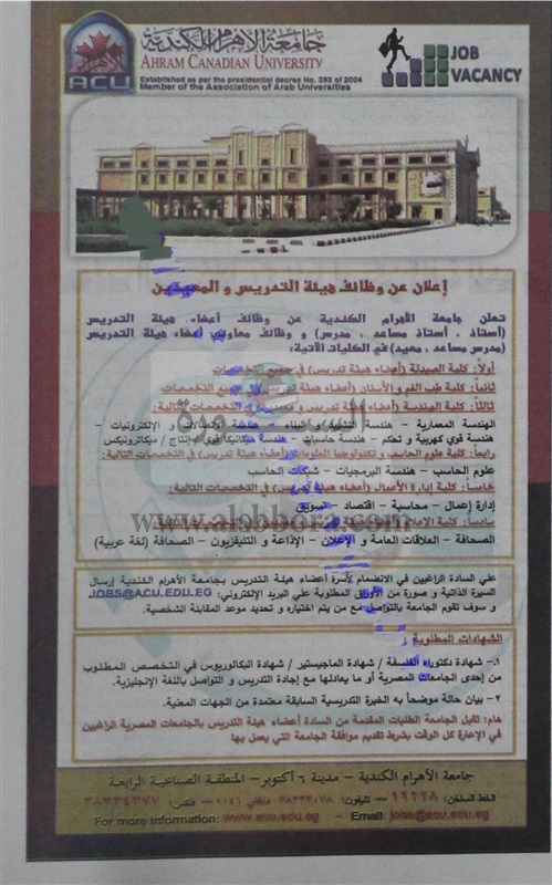 تعلن جامعة الاهرام الكندية عن حاجتها الى أعضاء هيئة التدريس من المعيد الى الاستاذ، فى 6 كليات ( الطب والهندسة والاعلام والصيدلة وعلوم الحاسب وإدارة الأعمال)، ولمزيد من التفاصيل عبر الاعلان المنشور فى جريدة الاهرام اليوم الموافق 2016/6/23.