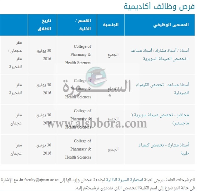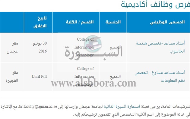 اعلنت عجمان الاماراتية عن حاجتها الى اعضاء لهيئة التدريس وذلك وفقا للبيان التالى: