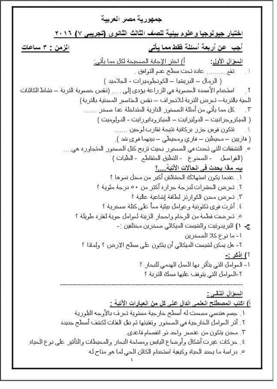 نشرت صفحة «شاومينج بيغشش الأزهر والعام» على موقع التواصل الاجتماعي «فيس بوك»، صورًا لنموذج امتحان تزعم أنه الامتحان التجريبي لوزارة التربية والتعليم في مادة «الجيولوجيا» لطلاب الثانوية العامة 2016، والذي من المقرر أن يؤديه طلاب القسم العلمي الثلاثاء.