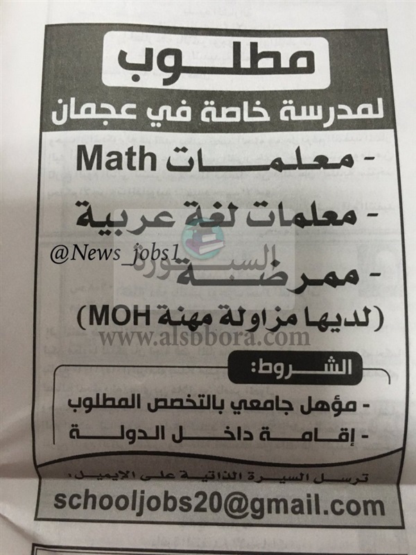 تعلن احدى المدارس الخاصة بمنطقة عجمان بالامارات العربية المتحدة عن حاجتها الى معلمات، وعلى الراغبين فى التقدم ارسال السيرة الذاتية على الايميل المنشور داخل الاعلان التالى: