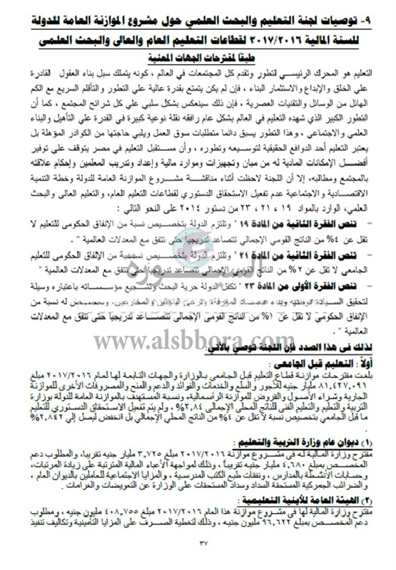 جدير بالذكر، أن لجنة التعليم والبحث العلمى بالبرلمان قد أوصت برفض مقترح الموازنة العامة للدولة، والتى تقدمت بها الحكومة إلى البرلمان للموافقة عليها، كما أعلن وكيل لجنة التعليم والبحث العلمى عبد الرحمن البكرى أن الموازنة فيما يخص التعليم والبحث العلم قد خالفت الدستور وأوصت اللجنة البرلمان بتوصيات على ثلاثة مراحل تم تقسيمها إلى المرحلة الأولى من التوصيات تخص التعليم قبل الجامعى والمرحلى الثانية التعليم العالى والجامعات والمرحلة الثالثة تخص البحث العلمى.