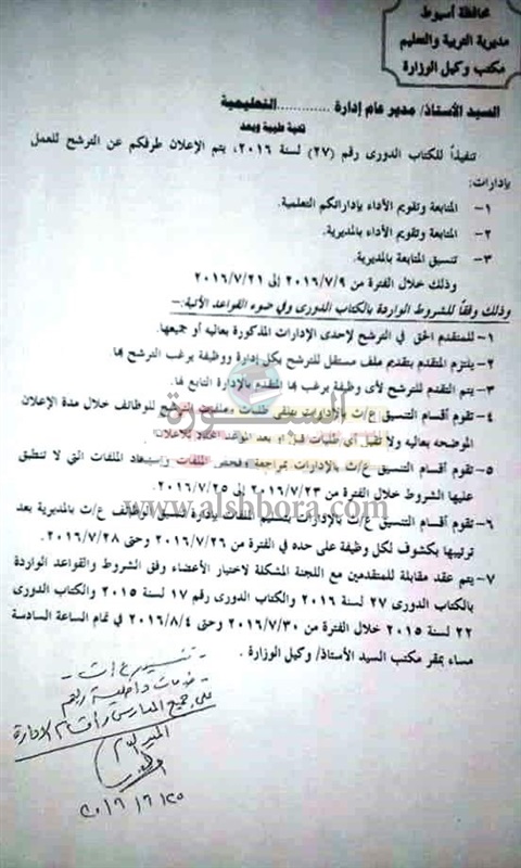 أعلنت مديرية التربية والتعليم بأسيوط عن فتح باب التقدم لشغل وظائف المتابعة بالمديرية والإدارات التعليمية