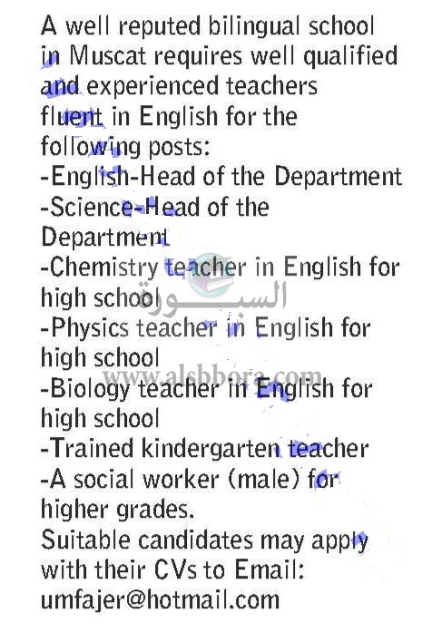 تعلن احدى المدارس الكبرى بسلطنة عمان عن حاجتها الى معلمين فى جمبع التخصصات، وعلى الراغبين فى التقدم ارسال السيرة الذاتية على الايميل المنشور فى الاعلان التالى: