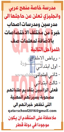 تعلن احدى المدارس الخاصة بدولة قطر عن حاجتها الى معلمين وعلى الراغبين فى التقدم ارسال السيرة الذاتية على الايميل المنشور فى الاعلان التالى: