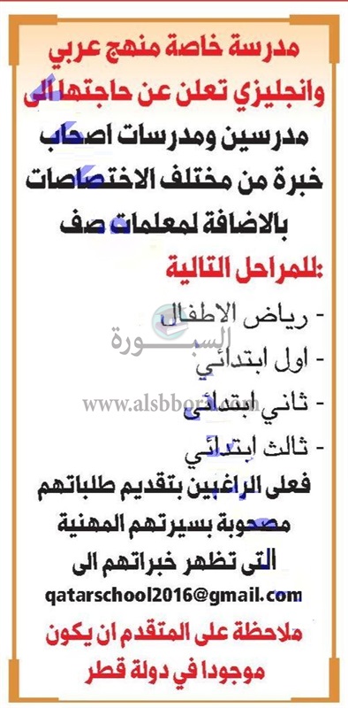 تعلن مدرسة خاصة في دولة قطر عن وظائف شاغرة للمعلمين في جميع المواد وذلك وفقا لنص الإعلان التالي: