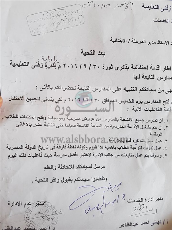 ينشر موقع "السبورة" الفاكس الخاص بادارة التربية والتعليم بزفتى، والذى ينص على الغاء إجازة 30 يونيو، واعتبار هذا اليوم يوم عمل عادل تمارس فيه الانشطة ويتم فتح المدارس لكى يتسنى للجميع بالاحتفال بهذا اليوم.