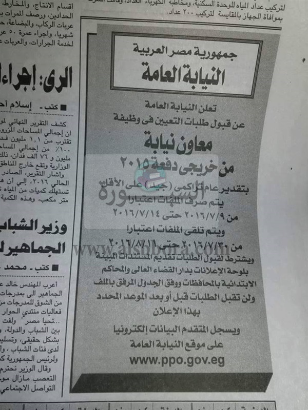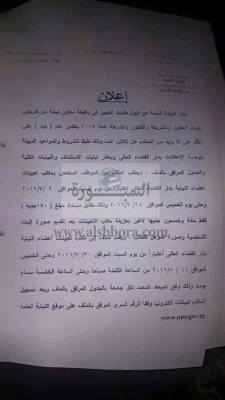 تعلن النيابة العامة عن قبول طلبات التعيين فى وظيفة معاون نيابة من خريجى كليات الحقوق والشرطة والشريعة والقانون دفعة 2015 بتقدير عام تراكمى (جيد) على الأقل