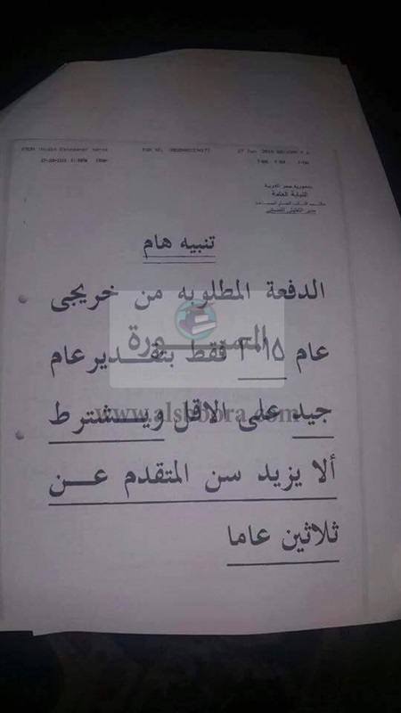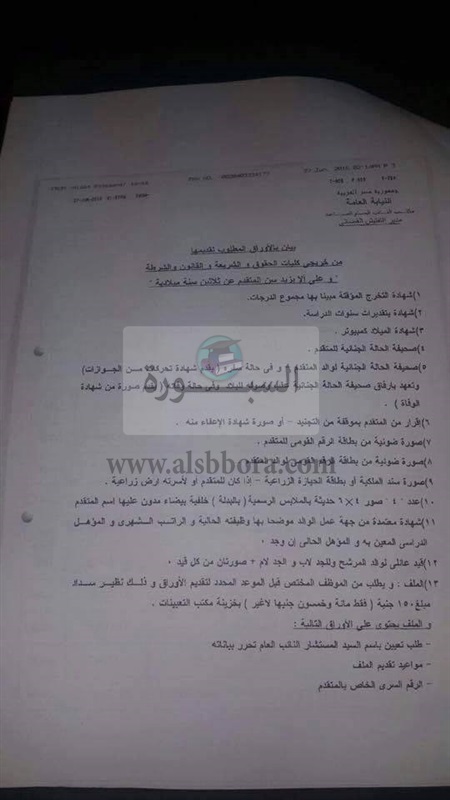 ويشترط لقبول الطلبات تقديم المستندات المبينة بلوحة الإعلانات بدارالقضاء العالى والمحاكم الابتدائية بالمحافظات ووفق الجدول المرفق بالملف، ولن تقبل الطلبات قبل أو بعد الموعد المحدد بهذا الإعلان