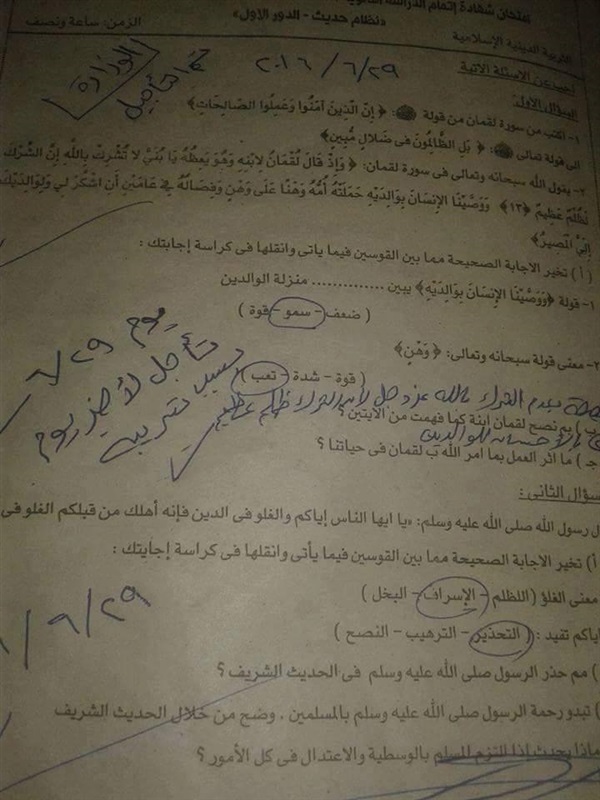 قامت صفحة "بالغش اتجمعنا" منذ ساعة تقريبا بنشر نموذج أسئلة امتحان التربية الاسلامية، الذى يؤدى فيه طلاب الثانوية العامة امتحاناتهم اليوم الأربعاء، مدعية أن هذا هو الامتحان الذى سوفيختبر فيه الطلاب.