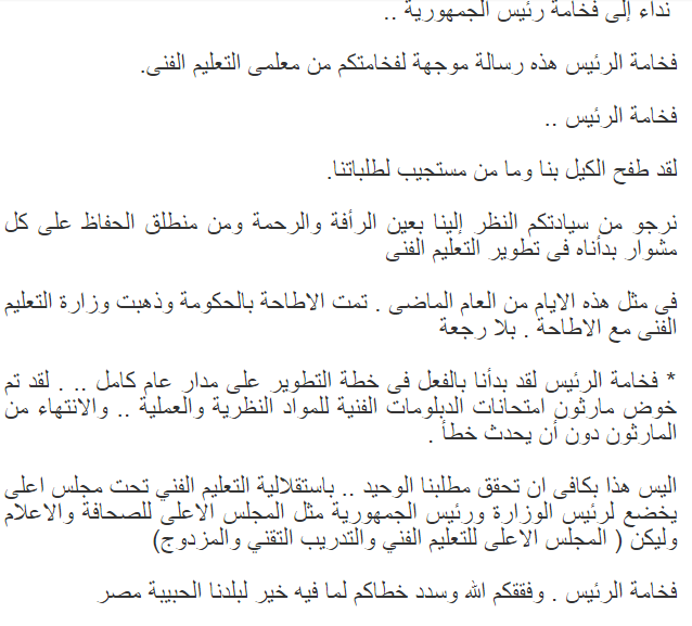 قام معلمو التعليم الفنى بتوجيه نداء الى السيد الرئيس عبد الفتاح السيسى ، كان نصه كالتالى: