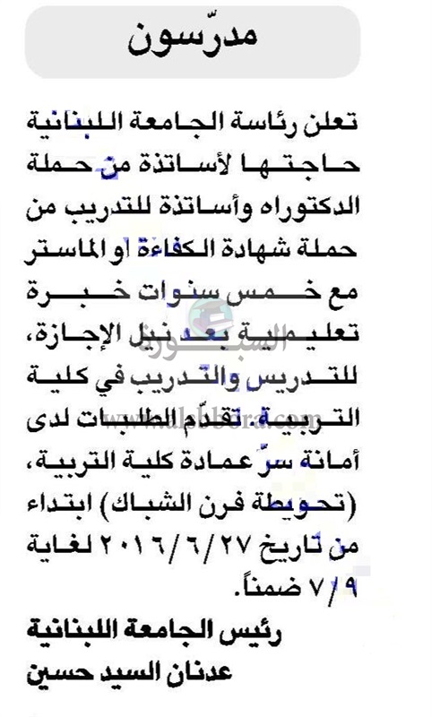 تعلن الجامعة اللبنانية عن وظائف شاغرة لأعضاء هيئة التدريس "من معيد الي أستاذ" وذلك وفقا لنص الإعلان التالي: