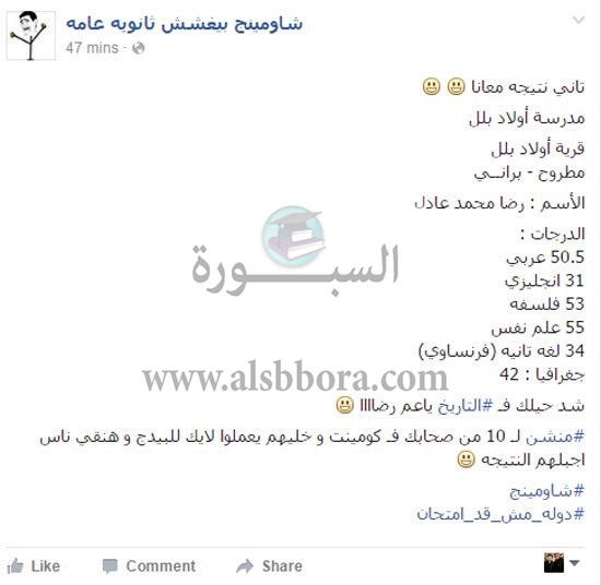 قامت صفحة "شامومينج بيغشش ثانوية عامة"، على موقع التواصل الاجتماعى "فيس بوك"، بنشر تسريباً لنتيجة زعمت أنها لأحد طلاب القسم الأدبى، بمدرسة أولاد بلل، التابعة لقرية تحمل نفس الاسم، بمحافظة مطروح.