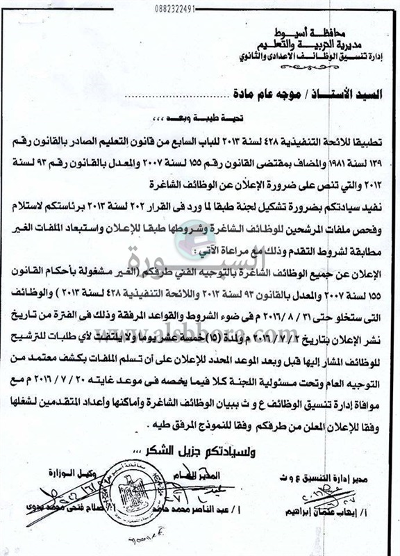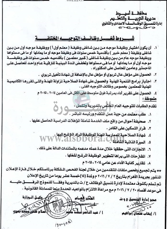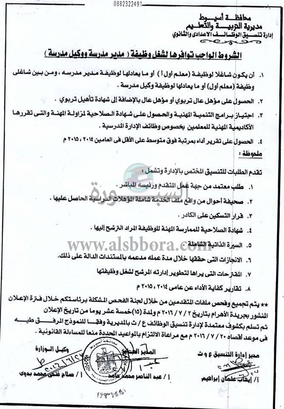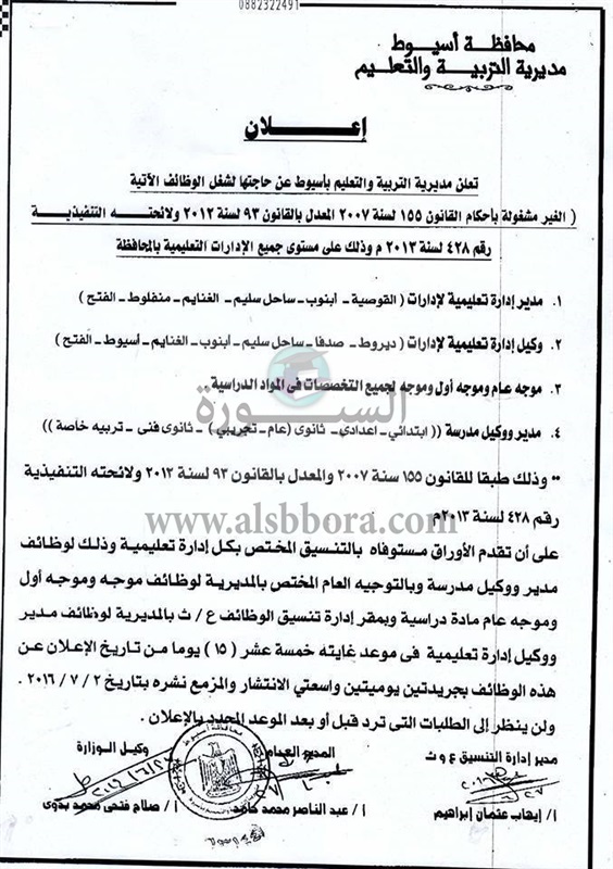 أعلنت مديرية التربية والتعليم بمحافظة أسيوط عن حاجتها الى قيادات لشغل وظائف بها وعلى الراغبين فى التقدم الى مديرية التربية والتعليم، ولمعرفة مزيد من التفاصيل داخل الاعلان.