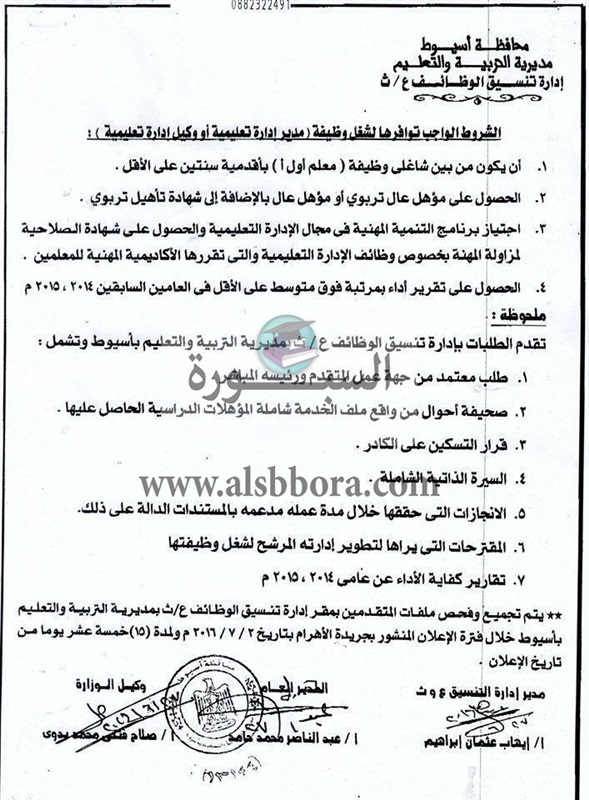 ينشر موقع السبورة الشروط الواجب توافرها لشغل وظيفة مدير أو وكيل إدارة تعليمية حسب ما جاء فى القانون المنظم لهذه العملية، والتى كانت قد أعلنت عنه مديرية التربية والتعليم بأسيوط منذ يومين عن حاجتها الى شغل وظيفتى مدير ادارة ووكيل ادارة تعليمية.