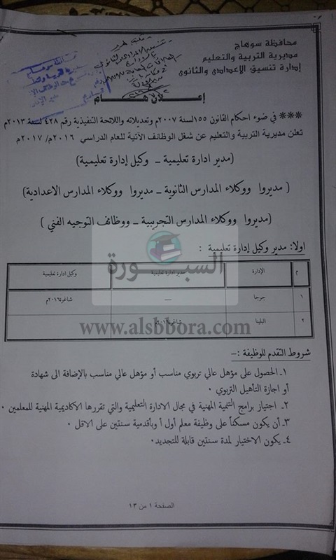 التعليم تعلن عن حاجتها الى مدير ووكيل ادارة ومدير ووكيل مدارس ثانوية واعدادية بادارات سوهاج.. ننشر الشروط المطلوبة ونص الاعلان