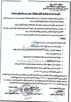 ينشر موقع السبورة الشروط التى وضعتها وزارة التربية والتعليم بشأن وظيفتى مدير ووكيل مدرسة بمديرية التربية والتعليم بمحافظة أسيوط.