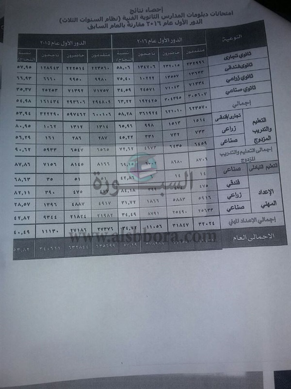 ينشر موقع السبورة احصائيات نتائج دبلومات المدارس الفنية نظام الـ "3 و5 سنوات" الدور الأول عام 2016، وبالمقارنة بالعام السابق.