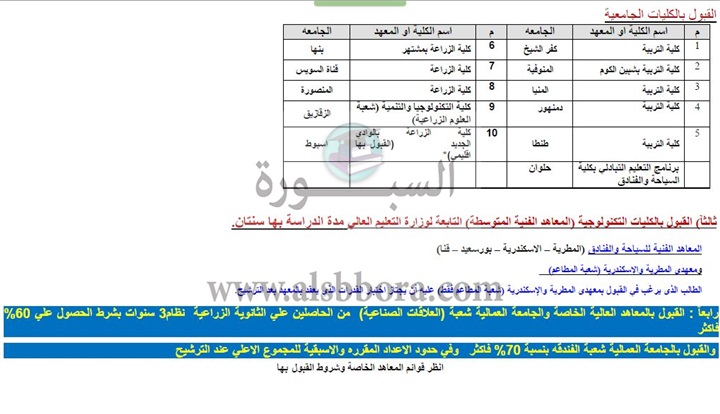 ننشر الكليات والمعاهد المتاحة لطلاب الدبلومات الزراعية والفندقية والتى حددها مكتب التنسيق