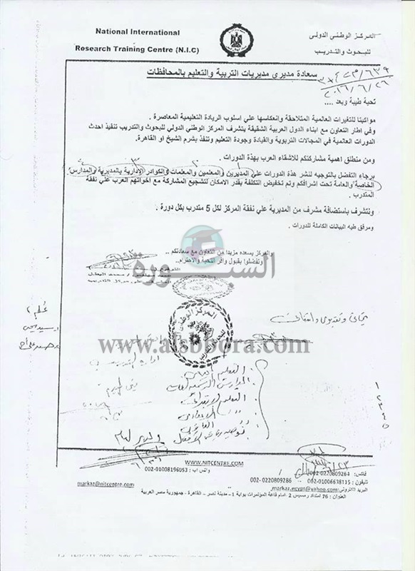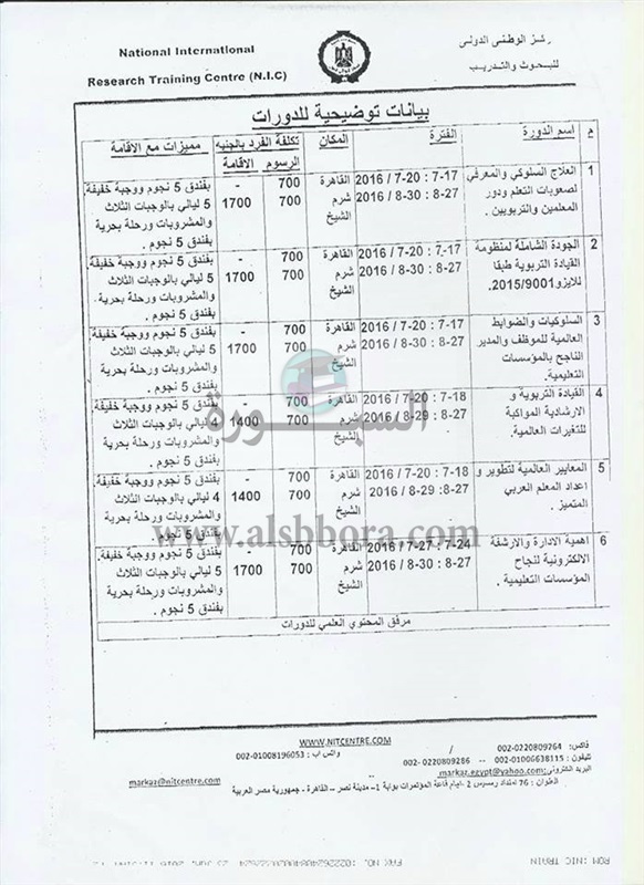 يعلن المركز الوطنى الدولى للبحوث والتدريب عن تنفيذ احدث الدورات العالمية في المجالات التربوية والقيادة وجودة التعليم والتى سوف تقام فى مدينتى شرم الشيخ او القاهرة، والتى تخص المديرين والمعلمين والمعلمات والكوادر الادارية بالمديرية والمدارس الخاصة والعامة وتم تخفيض التكلفة بقدر الامكان لتشجيع المشاركة مع اخوانهم العرب على نفقة المتدرب.
