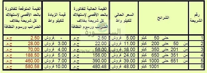 و أشار المتحدث الرسمي باسم وزارة الكهرباء، إلى أن الشريحة الرابعة والتي تبدأ من ٣٥١ إلى ٦٥٠ كيلو وات تصبح 29قرش بدلاً من 24 قرش للكيلو، والشريحة الخامسة والتي يتراوح استهلاكها ما بين ٦٥١ كيلو إلى ألف كيلو تصبح 46 قرش بدلاً من 39 للكيلو وات، والشريحة السادسة والأخيرة التي يزيد استهلاكها على ألف كيلو وات يزيد سعر الكيلو من ٤٨ إلى 58 قرشا.