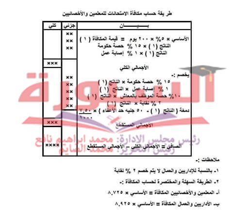 تنشر "" طريقة حساب مكافأة الامتحانات وذلك للمعلمين والاخصائيين الاجتماعيين والاداريين وهي كالتالي: