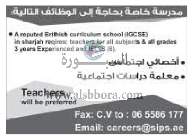 تعلن احدى المدارس الخاصة بدولة الامارات العربية المتحدة عن حاجتها الى معلمين ومعلمات، وعلى الراغبين فى التقدم ارسال السيرة الذاتية عبر الايميل المنشور فى الاعلان التالى: