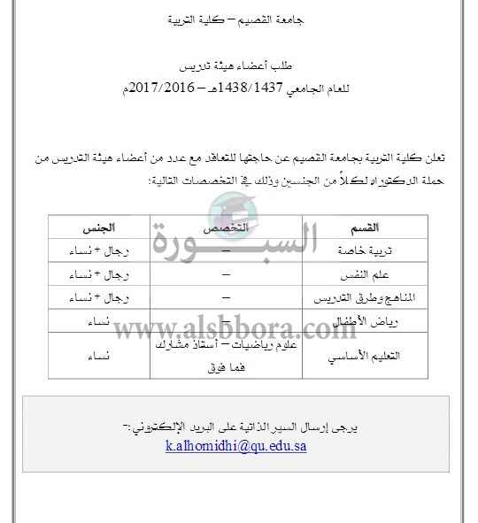 تعلن جامعة القصيم السعودية عن وظائف جديدة لأعضاء هيئة التدريس وذلك في التخصصات الواردة في الإعلان التالي: