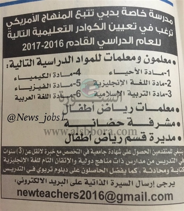 تعلن احدى المدارس الخاصة بامارة دبى بالامارات العربية المتحدة عن حاجتها الى معلمين ومعلمات لمدارس تتبع المنهج الأمريكى.