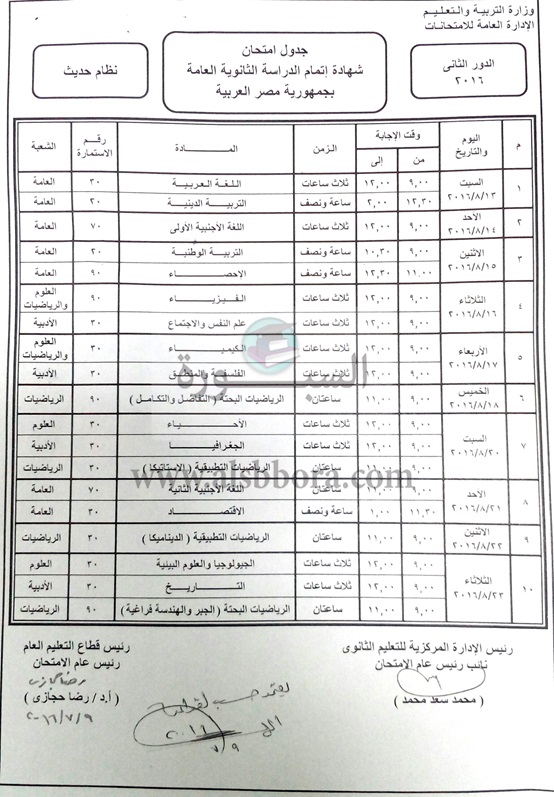 اعتمد الدكتور الهلالى الشربينى وزير التربية والتعليم والتعليم الفنى جدول امتحانات شهادة إتمام الدراسة الثانوية العامة الدور الثانى (نظام حديث) للعام الدراسى 2015/2016 حيث تبدأ الامتحانات يوم السبت الموافق 13/8/2016، وتنتهى الثلاثاء 23/8/2016.