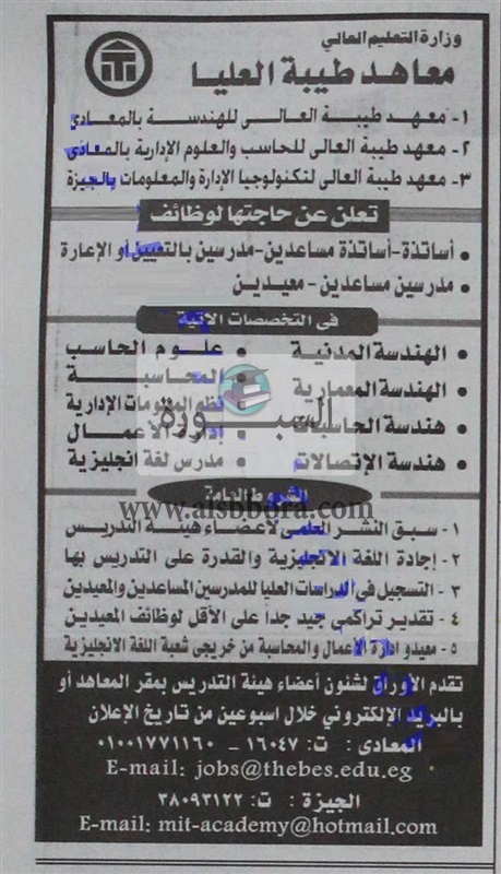 تعلن معاهد طيبة العليا عن وظائف لأعضاء هيئة التدريس" من معيد الي أستاذ" وذلك وفقا لنص الإعلان التالي: