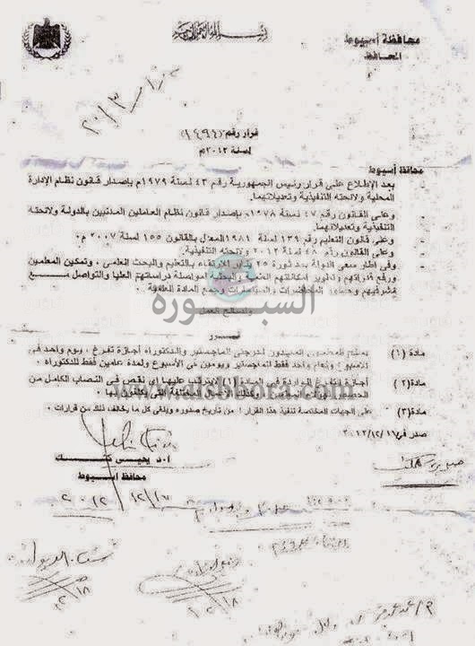 الجدير بالذكر أن المحافظين قد قرروا الموافقة على القرار رقم 21839 بتاريخ 7/9/2014 والمتضمن منح العاملين المقيدون لدراسة الماجستير او الدكتوراه ايام اجازة تفرغ للدراسة اسبوعيا، حيث جاء نص القرار كالتالى: