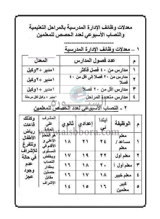 ينشر موقع السبورة معدلات وظائف الادارة المدرسية بالمراحل التعليمية والنصاب الأسبوعى لعدد الحصص للمعلمين، حيث جاءت كالتالى: