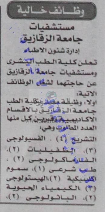 تعلن الزقازيق عن حاجتها الى أعضاء هيئة التدريس، وعلى الراغبين فى التقدم ارسال السيرة الذاتية على الايميل المنشور فى الاعلان التالى: