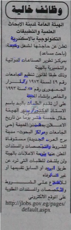 تعلن الهيئة العامة لمدينة الابحاث العلمية والتطبيقيات التكنولوجية بالاسكندرية عن حاجتها لشغل وظيفة باحث مساعد بمركز تطوير الصناعات الدوائية والتخميرية بالهيئة، على أن تقدم الطلبات باليد باسم الاستاذ الدكتور/ مدير الهيئة خلال 15 يوما من تاريخ نشر الاعلان، والذى تم نشره فى جريدة الجمهورية اليوم الابعاء الموافق 2016/7/13.