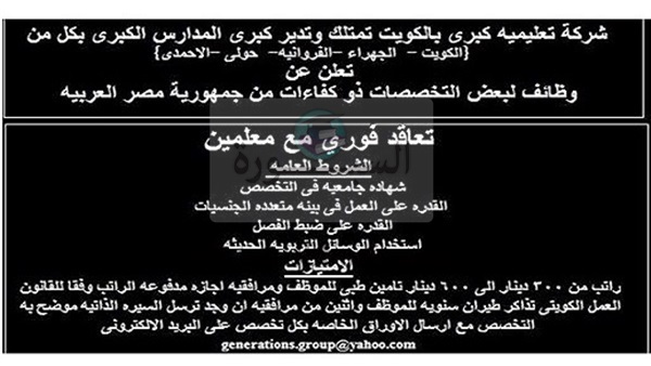 تعلن عدد من كبري المدارس الكويتية بكل من " الكويت – الجهراء – الفروانية – حولي – الاحمدي "عن وظائف للمعلمين ذو كفاءات من