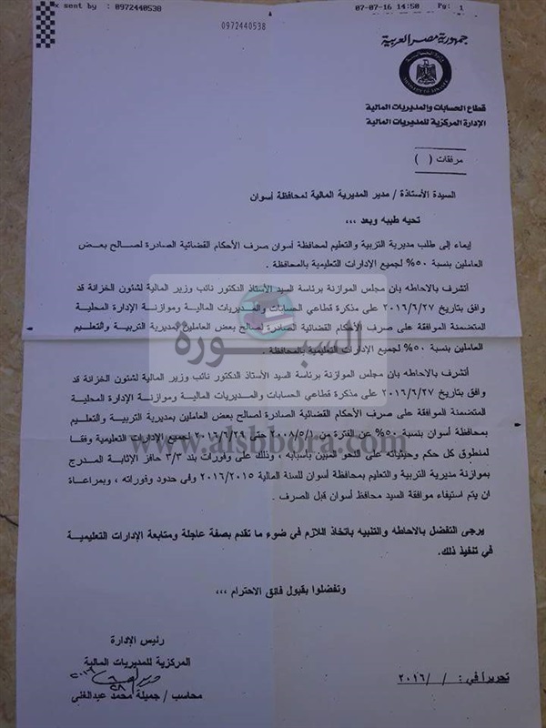 ننشر فاكس وزارة المالية بشأن صرف حافز الاثابة للمعلمين بنسبة 50% من المبلغ المستحق لهم