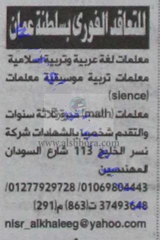 تعلن احدى المدارس الكبرى بسلطنة عمان عن حاجتها الى معلمات، وعلى الراغبين فى التقدم ارسال السيرة الذاتية على الايميل المنشور فى الاعلان بجريدة الأهرام اليوم الجمعة الموافق 2016/7/15.