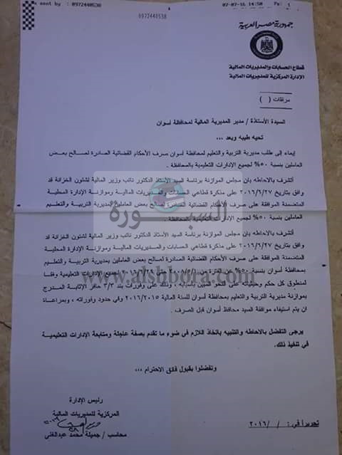 على المذكرة التى تقدمت بها مديرية التربية والتعليم بأسوان، لصرف الأحكام القضائية