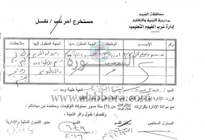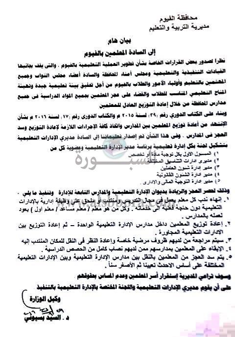 ينشر موقع السبورة بيان هام صادر من مديرية التربية والتعليم بمحافظة الفيوم، حيث يتضمن انهاء ندب كل معلم يعمل فى مجال التدريس ومنتدب او ملحق على وظيفة ادارية الادارات التعليمية دون حاجة فعلية الى خدماته، وكل من هو (معلم/ معلم مساعد/ معلم أول) يعود لعمله بالمدارس.