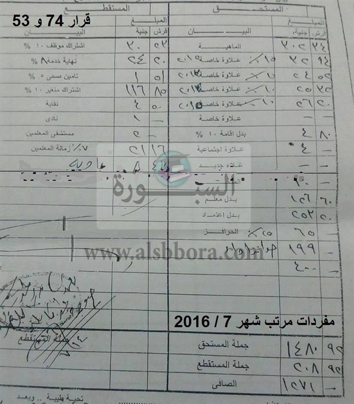 ننشر مفردات مرتبات المعلمين الجدد لشهر يوليو 2016 بقرارت أرقام 53، 74، 244، 280، 231، 93، 423