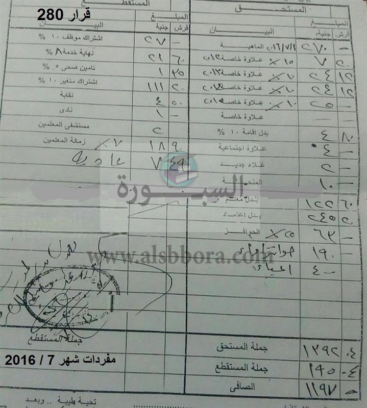 - مفردات مرتب قرار 280 اساسى الراتب 270 جنيها والراتب الصافى 1197 جنيها فقط لاغير