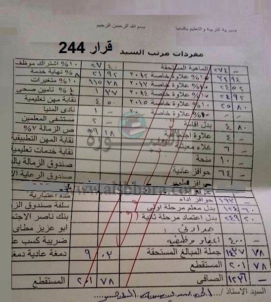 -مفردات مرتب قرار 244 اساسى الراتب 274 جنيها والصافى للراتب 1236 جنيها فقط لاغير